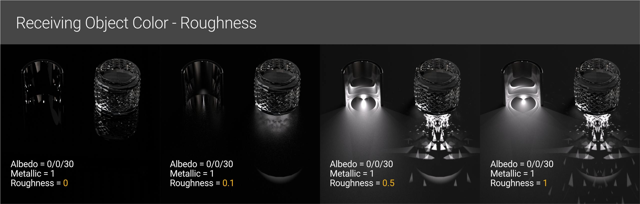Roughness is the most simple property to understand. The rougher the reflective casting material, the more light rays it disperses and the blurrier and weaker the caustic pattern. Fine bump or normal maps have the same impact on roughness, thus we need to apply these carefully.