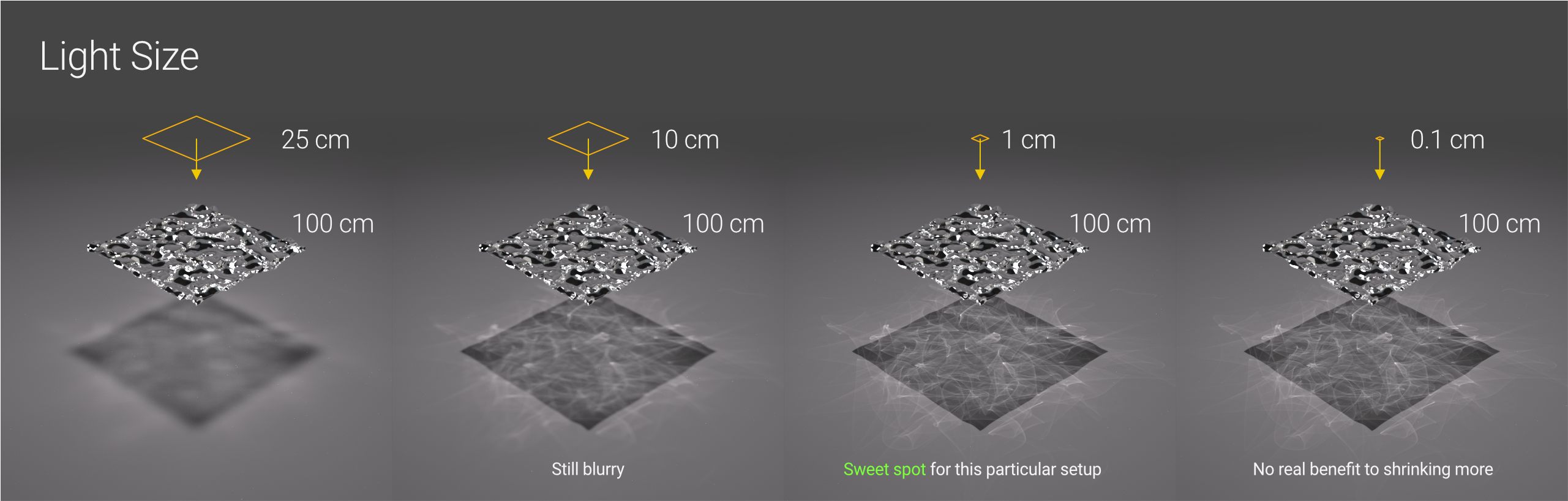 We can reduce the surface area of the light in comparison to our casting object. This means that fewer rays will hit our object, but those rays will be more parallel than in a larger light because the other, more sharply angled ones will simply miss it. If we use Surface Brightness, we must make the tiny light stronger than the larger one. A closer, smaller light will enlarge and distort the caustics/shadow area, which may or may not be okay. If caustics are a key goal of the render, one of the simplest methods to alter the sharpness is to change the size of the lights that impact the casting objects.