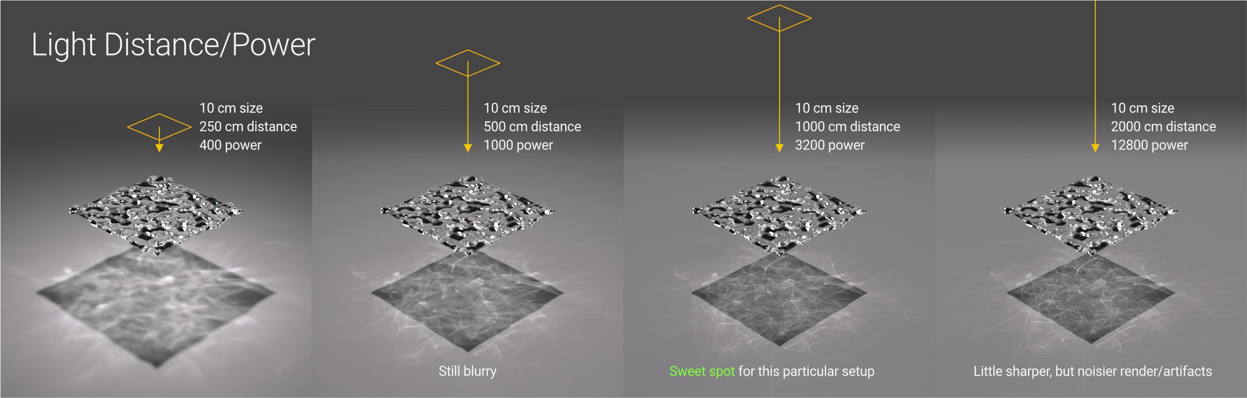 The base color should be reasonably dark and non-reflective (Albedo V (value) is ranging from 20 to 30, with Specular and Metallic channels set to 0 producing decent results). This will also modify as the light’s intensity varies. In general, the lighter the material on the receiving item, the more the caustic patterns are washed out. However, it cannot become too dark, or it will absorb all of the light, as seen on the far left in the above image.