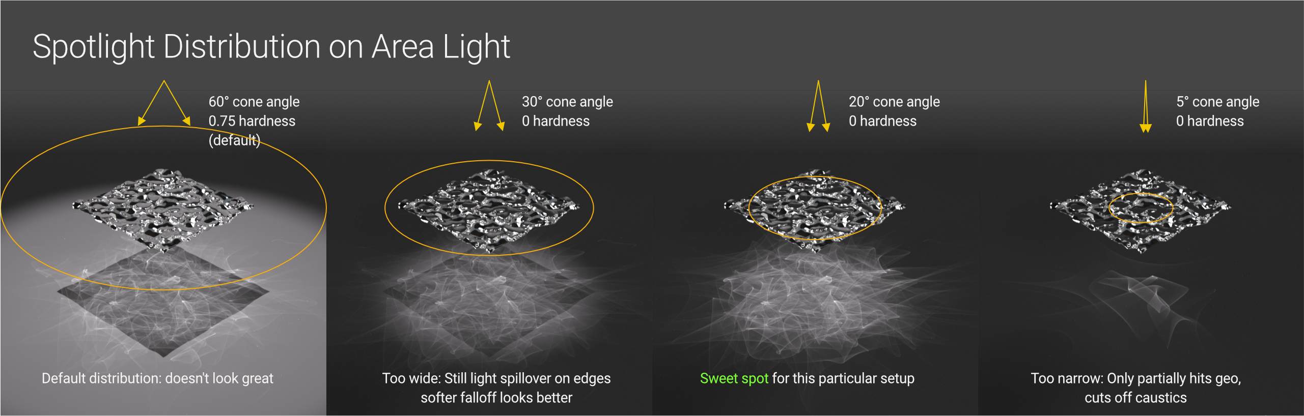One of the major problems with shining a bright light on a surface is that the light can muddy or wipe out the caustic pattern. There are a number of options for dealing with this, such as gobos, IES lights, and physically blocking rays with geometry, but a Spotlight Distribution node is a quick and straightforward approach we may consider.