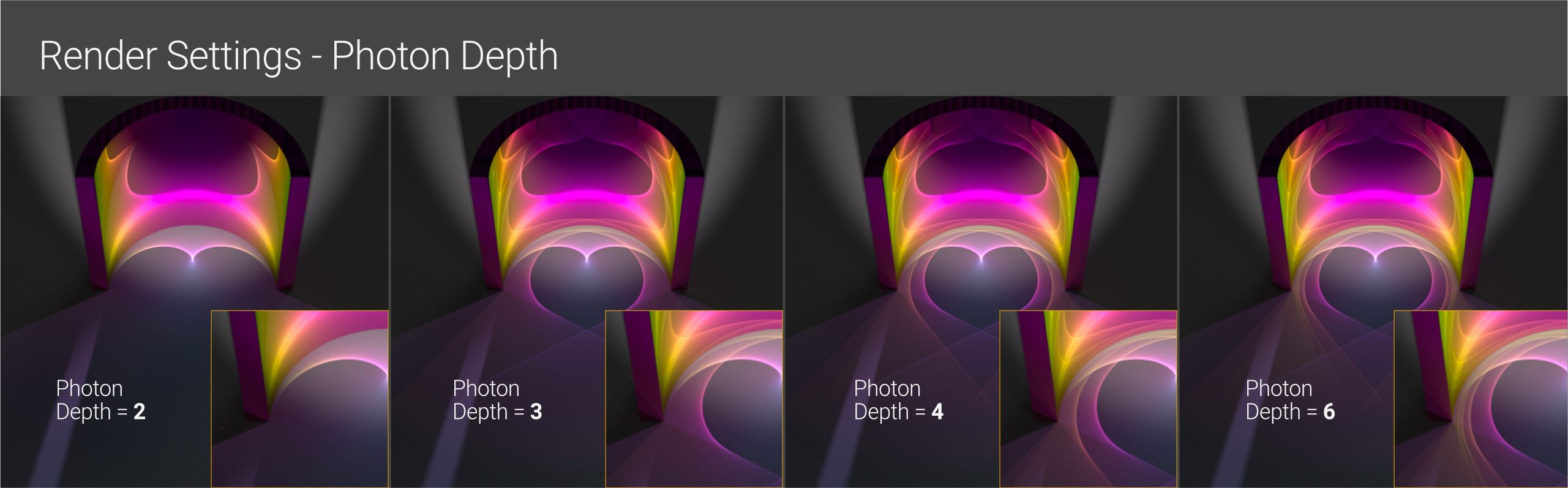 Photon depth: Similar to Diffuse/Specular/Scatter depth, this refers to how many times photons will bounce through different materials until they become extinct. For the most part, we may leave it at (6), but if we have a lot of panes of glass or multiple mirrors in a scene, we’ll want to increase it. It has little effect on render speed, so we’d only want to reduce it if we’re getting wild caustics that we don’t want for visual reasons.