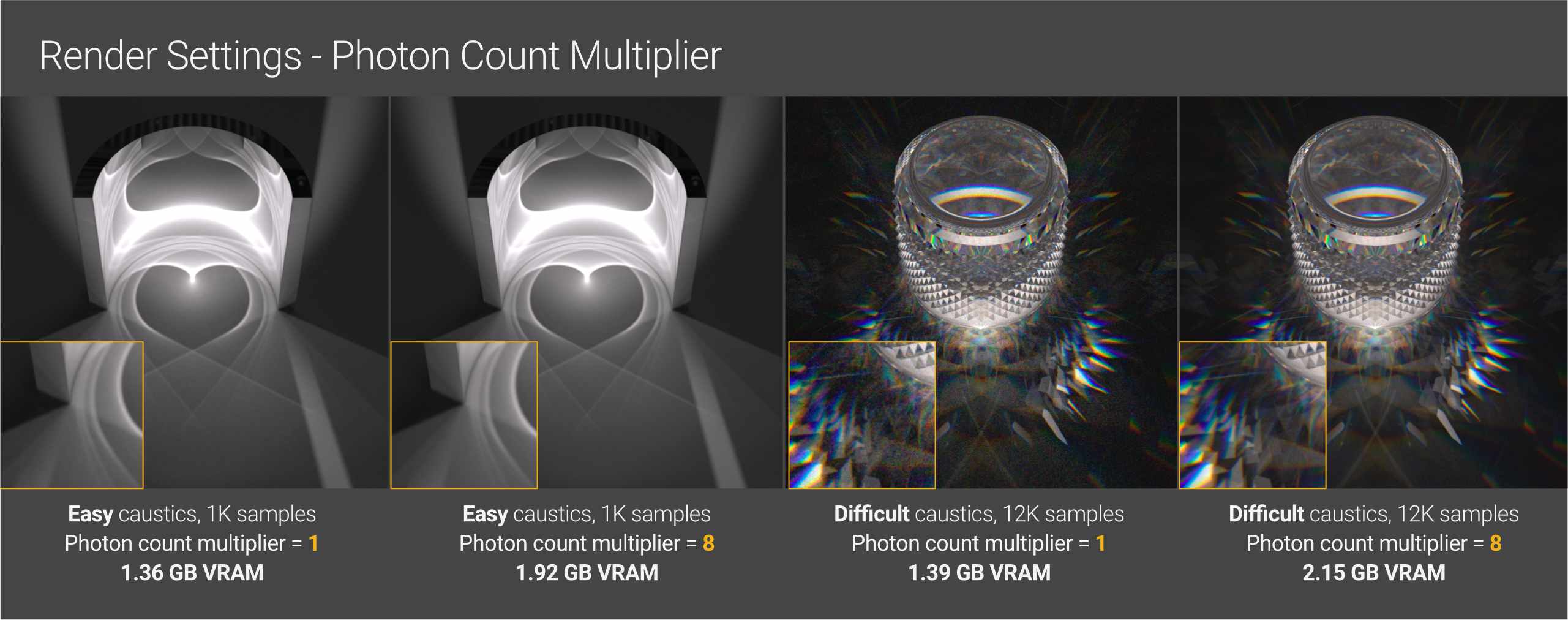 As a general rule, if the scene has simple caustics (one light source, reflective material, or mild caustics that aren’t a major component of the scene), the default of 2 will serve, and more emphasis is placed on making the rest of the scene seem better quickly. If the scene is all about the caustics, with crazy, jagged patterns, refraction, and dispersion, and the GPU is huddled in the corner, crying out, set this to 8 if you have the VRAM for it.
