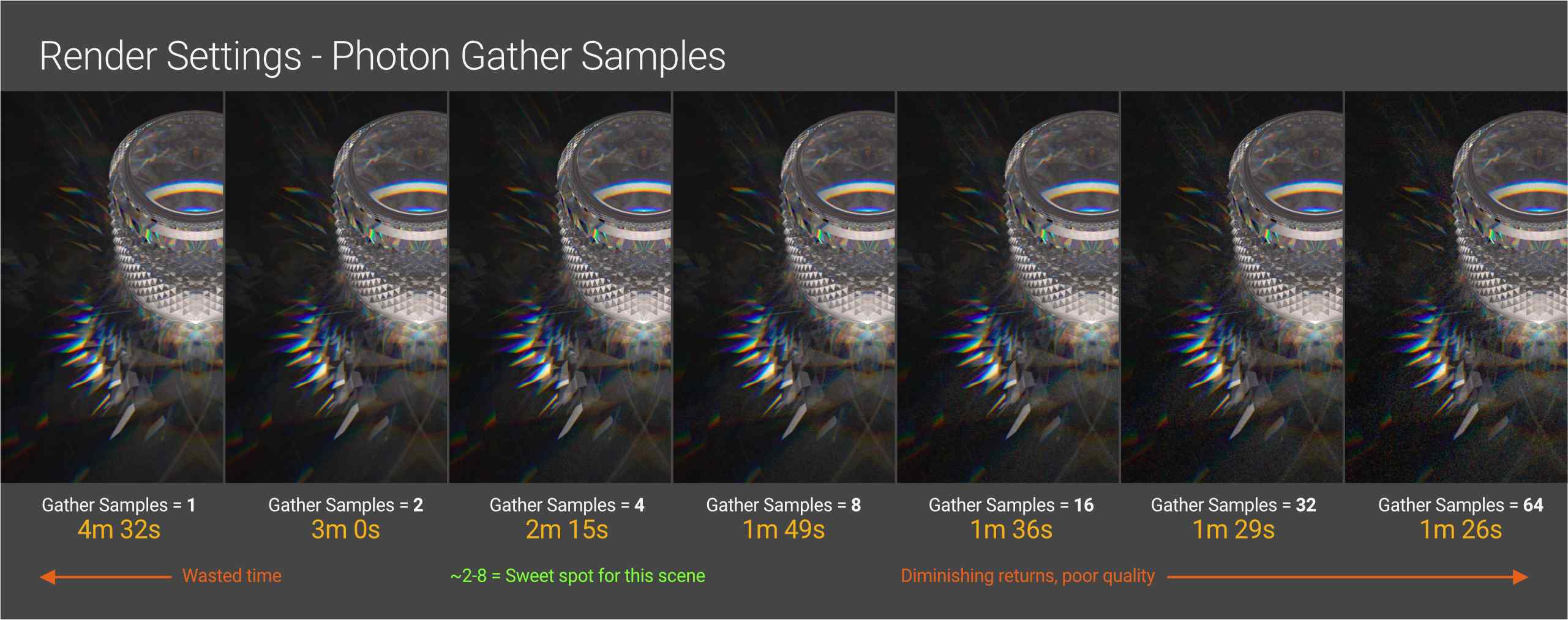 Photon Gather Samples – depending on the scene’s structure and noise tolerance, this can significantly speed up caustics renders. For the example above, 2 (default) delivers decent quality at a reasonable render time given the hardware, use case, size, and so on. When the gather samples are increased to 4, the render time is virtually cut in half, which is fantastic for lookdev, but it introduces some noise, which may or may not be acceptable. As the number of samples increases, the noise increases dramatically while the render times just slightly improve. The trick is to locate the sweet spot for lookdev and then the final render. (8 and 2 for this scene, respectively).