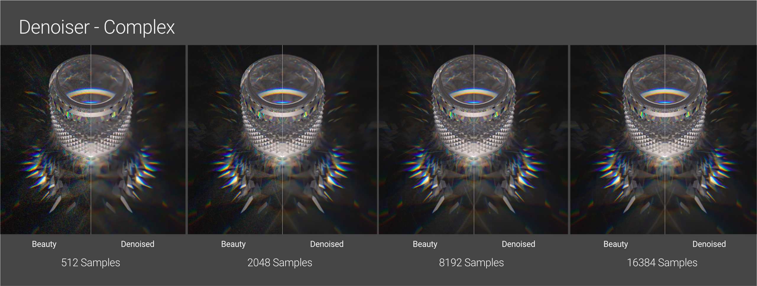 In a complex setup like this, we have noticed that the denoiser eats away the fine caustic patterns (particularly in the center right at the base of the cylinder and also on the back wall of it). It is not until we reach the 8192 range that it becomes suitable for final output.