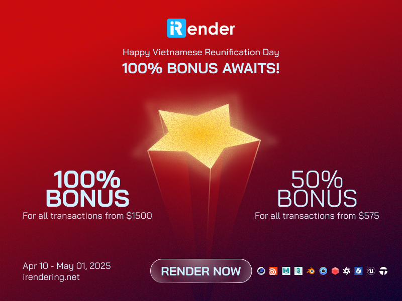 Right now iRender has a SPECIAL PROMOTION program with a 100% bonus for the first transaction within 24 hours of your registration. It means that you can get an extra 100% of the money you recharged the first time. And points never expire, so you can use them at any time. Moreover, we have the special promotion for this month: