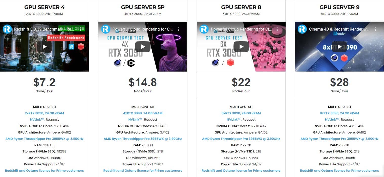 Since the recommended Redshift specifications suggested above, iRender provides 3 types of multi-GPU-servers (2/4/6/8x RTX 3090) which are the most effective for Redshift rendering in multi GPU cards coming with the following configuration specifications: