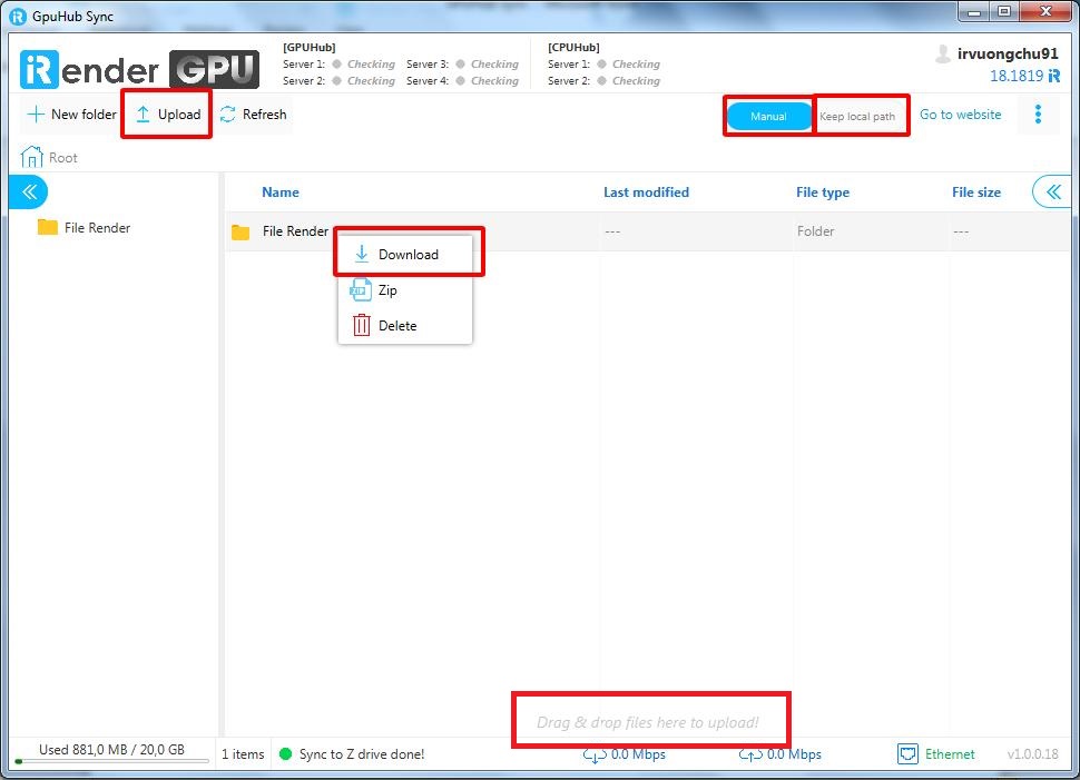 Keep Local Path: This option will allow the tool to create a same directory that use to lead to the file in the user’s PC. For example: if you save a file at C:/Documents/Render/, when you choose this option, GPUHub Sync will create a directory on the driver Z as follow: Z:/C/Documents/Render. With this option, users that work on multiple projects at the same time won’t have to worry about sorting different files for different projects. This will also help users to manage the files and the progress of each project better.