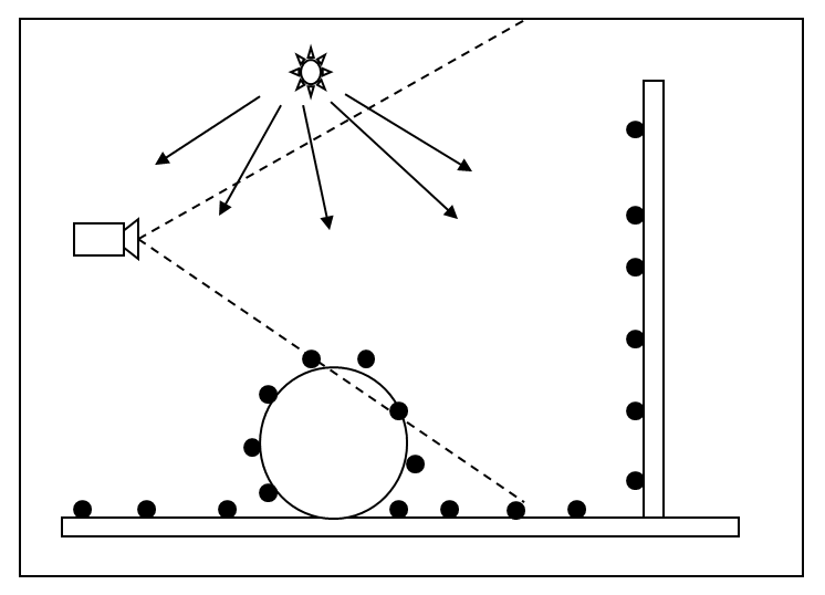 Shooting photons from lights or rays from our eyes produces, in some ways, equivalent results. If we flip the direction of all the above arrows, it will be as if lighting went from the light source and bounced off sphere surfaces, floor, wall, and reach the camera.