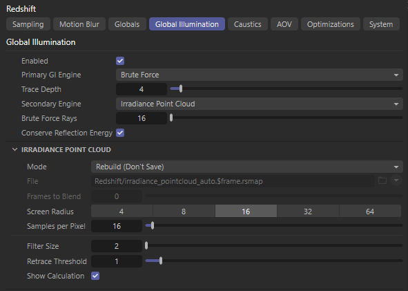 • Set the Secondary GI Engine to “Irradiance Point Cloud”