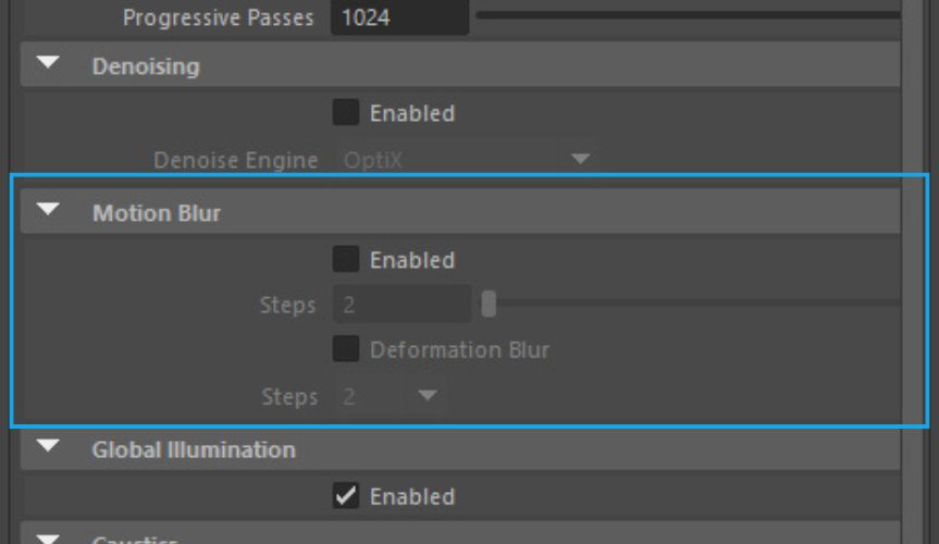 • Deformation Blur: This toggle controls whether vertex-level deformation blur is included. Since Deformation Blur can consume a lot of memory, it’s best to leave it disabled if your objects don’t have animated deformations, to optimize performance.