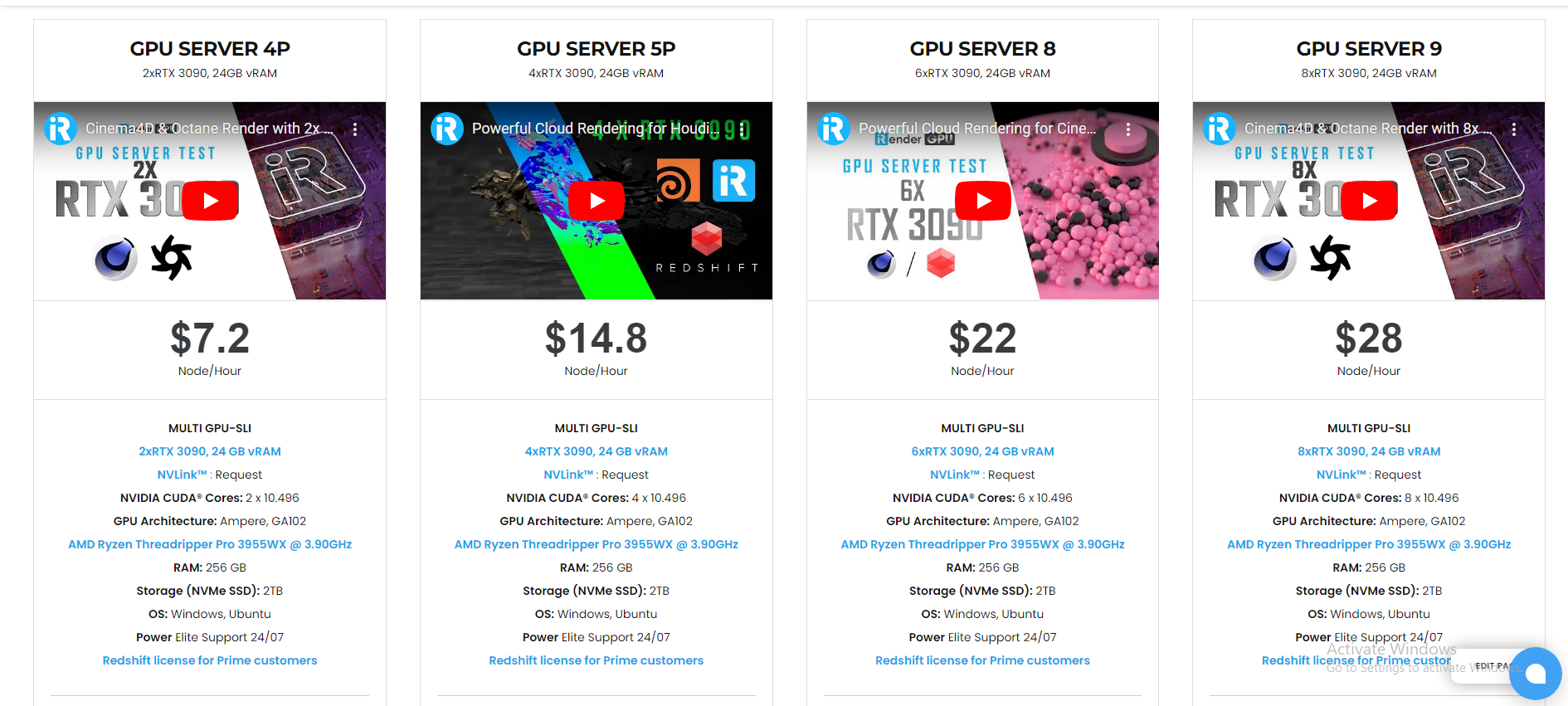 We have developed multiple RTX 3090 server packages that are specifically configured and optimized for GPU rendering. With a range of GPU servers from a single RTX 3090 to multiple 2/4/6/8 x RTX 3090, you can choose a server that meets your needs and your software to start the rendering process. All information on the server configuration is publicly posted on our website. You can know exactly what the server specification contains, the type of CPU and GPU it has, and its cost as well.