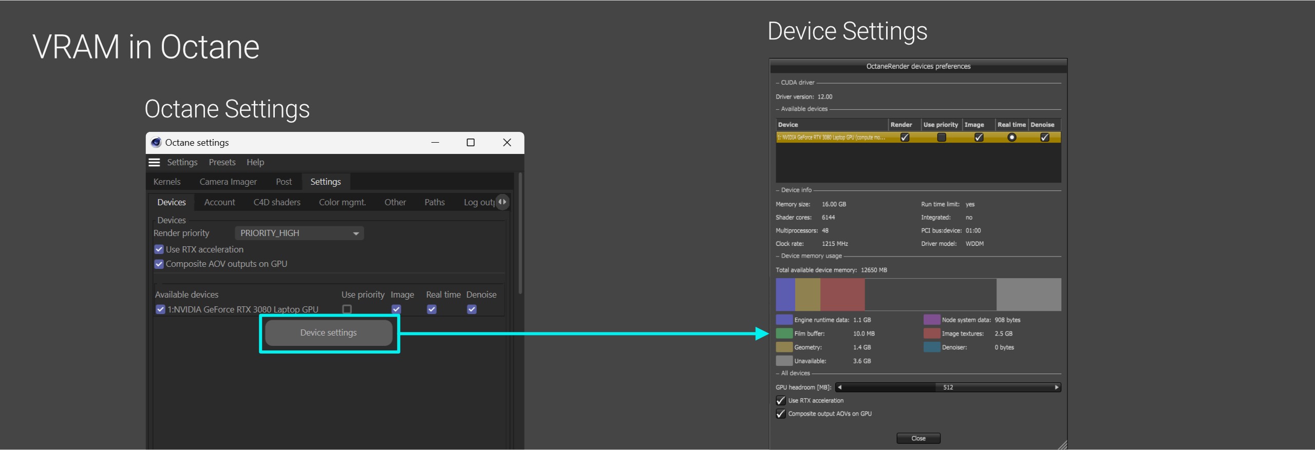 One of the most useful places to check VRAM usage is the Device Settings window. This can be accessed by clicking the gear icon for Octane Settings, switching to the Settings tab, and then clicking the Device Settings button. The window provides a breakdown of how VRAM was utilized in the last rendering operation. This is very convenient information.