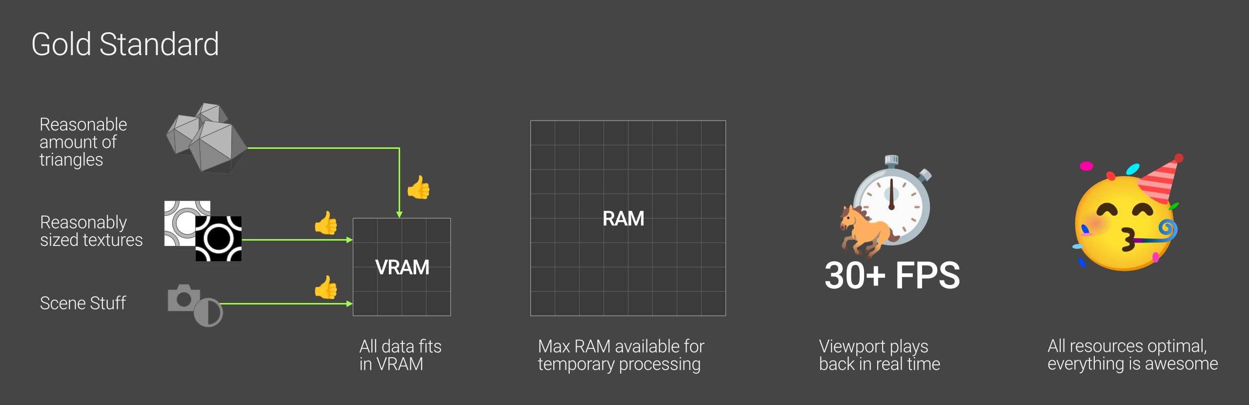 The ideal scenario is for all graphics data (textures, geometry, etc.) to fit into the graphics memory (VRAM). This allows for optimal rendering speed. However, some scenes may be too large to fit all their assets in VRAM.