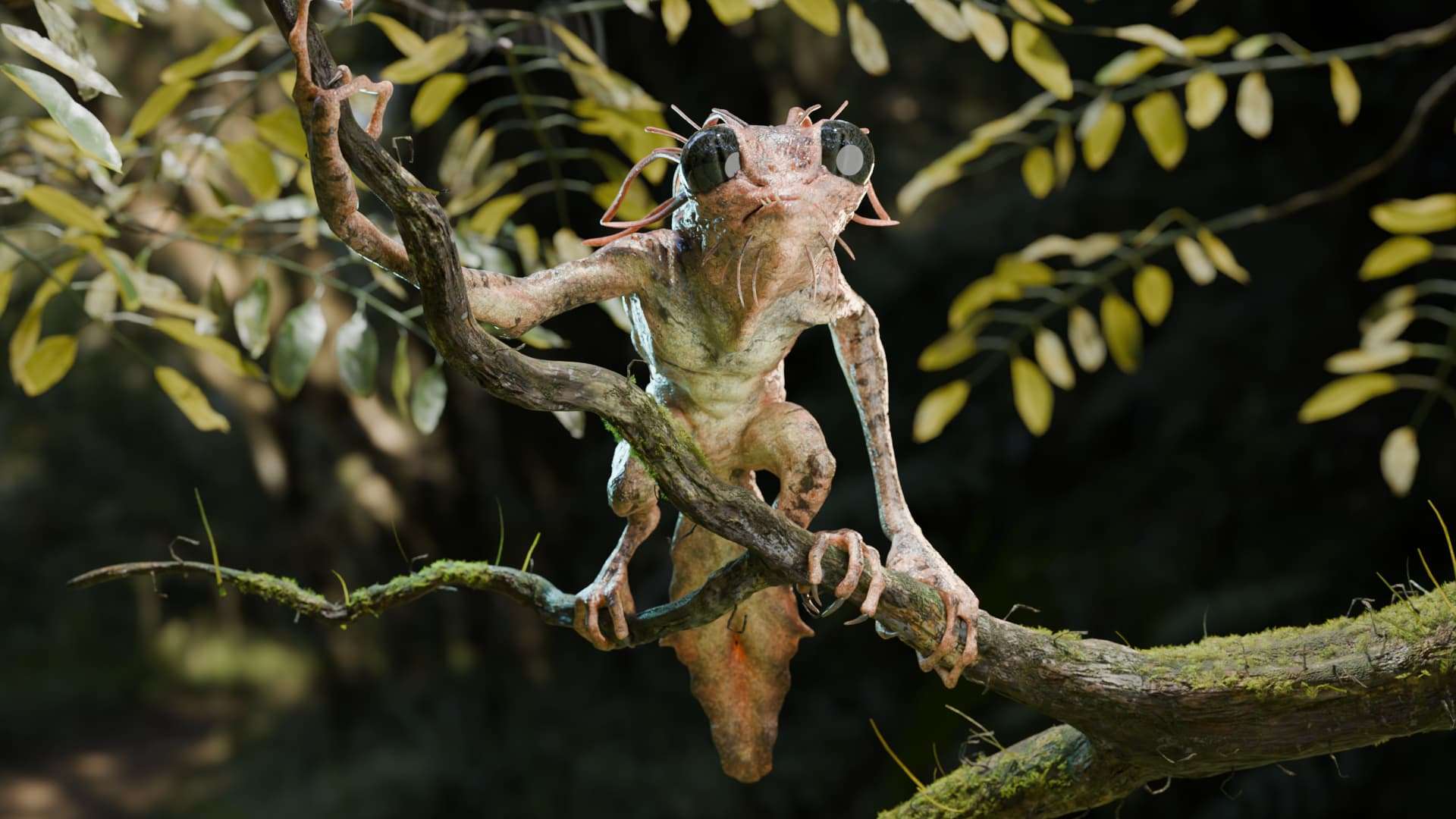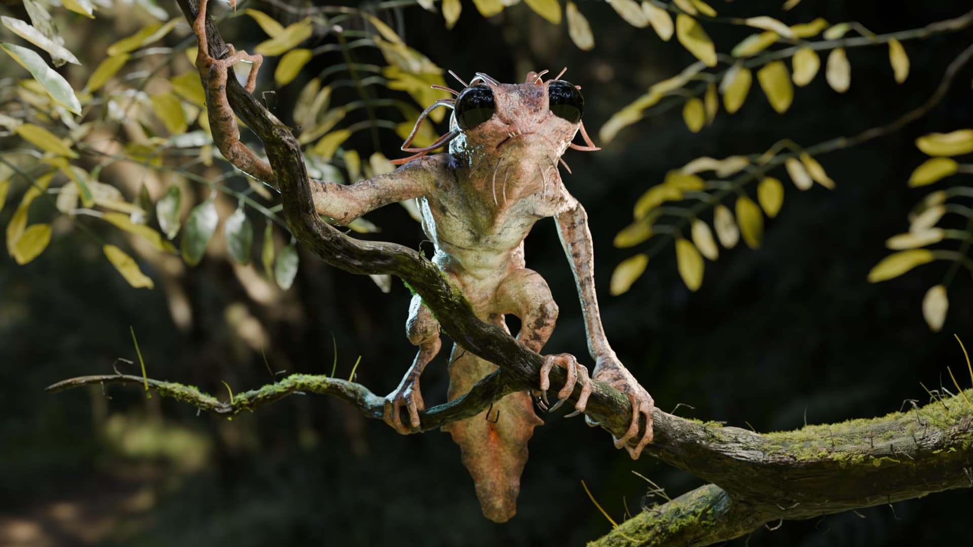 Ex 2: Light linking is used to artificially eliminate reflections on the eyes and tree branches.