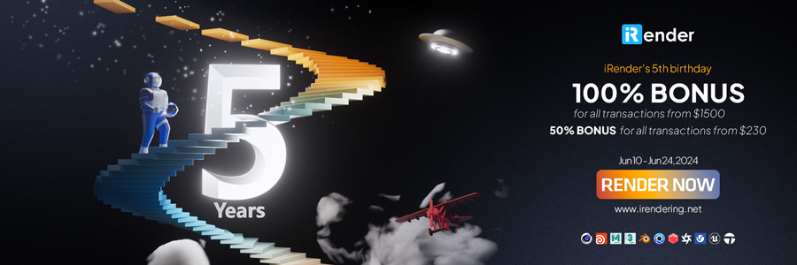 This month, we have a HOT DEAL: iRender’s 5th birthday. You will receive 100% BONUS for all transactions from 1500$ and 50% bonus for all transactions from 230$ from 10th June to 24th June 2024. Don’t miss out!!